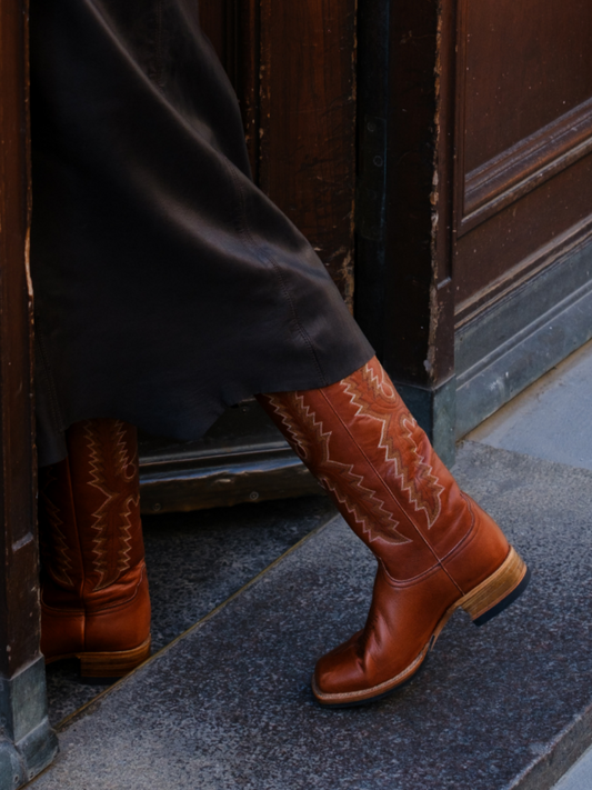 Cognac Embroidery Square-Toe Wide Mid Calf Tall Cowgirl Boots