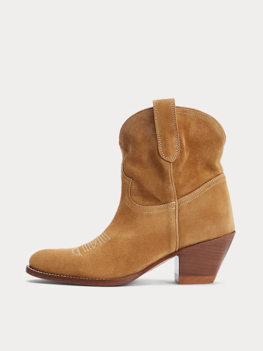 Caramel Faux Suede Almond-Toe Classic Wide Mid Calf Cowgirl Boots