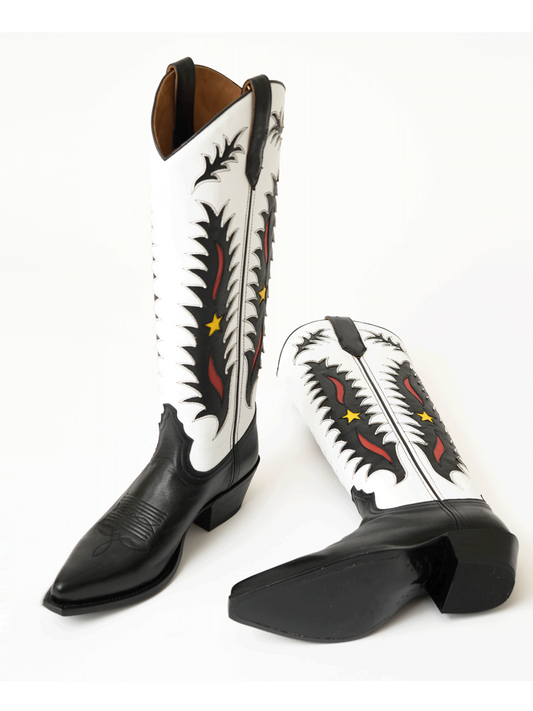 Contrast Black And White Snip-Toe Leaf And Star Inlay Wide Mid Calf Tall Cowgirl Boots