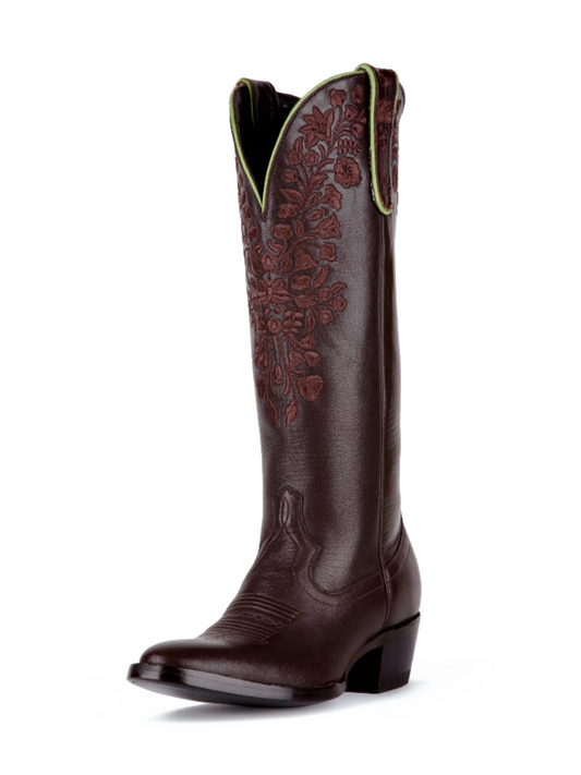 Chocolate Round-Toe Flowers Embroidery Wide Mid Calf Tall Cowgirl Boots