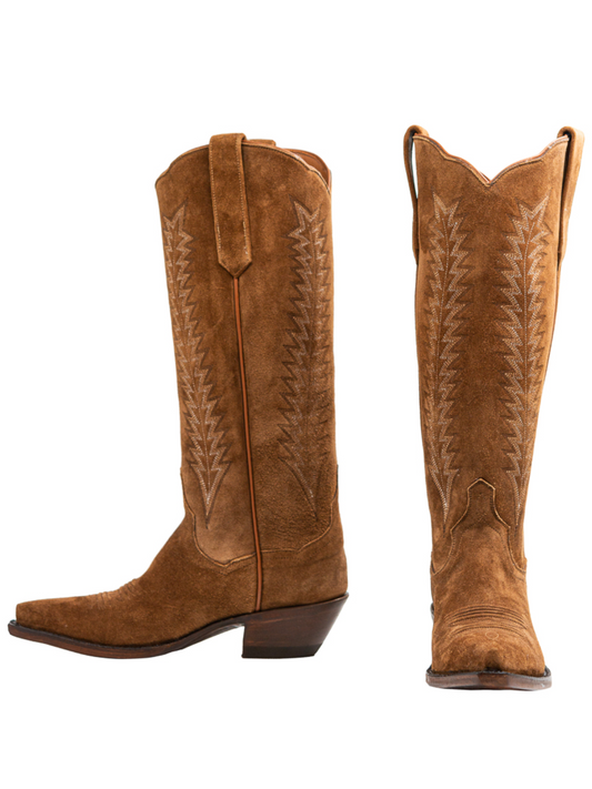 Cognac Faux Suede Snip-Toe Embroidery Wide Mid Calf Tall Cowgirl Boots