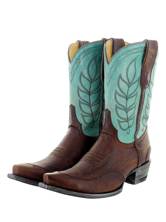 Contrast Brass And Aqua Snip-Toe Leaves Embroidery Wide Mid Calf Cowgirl Boots