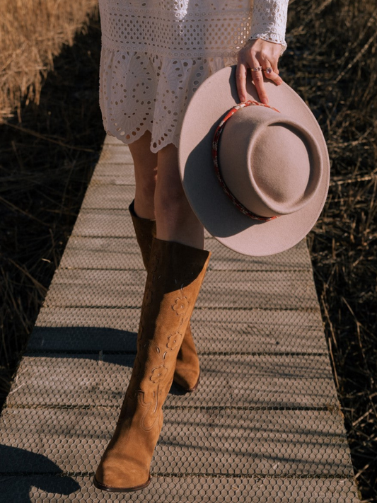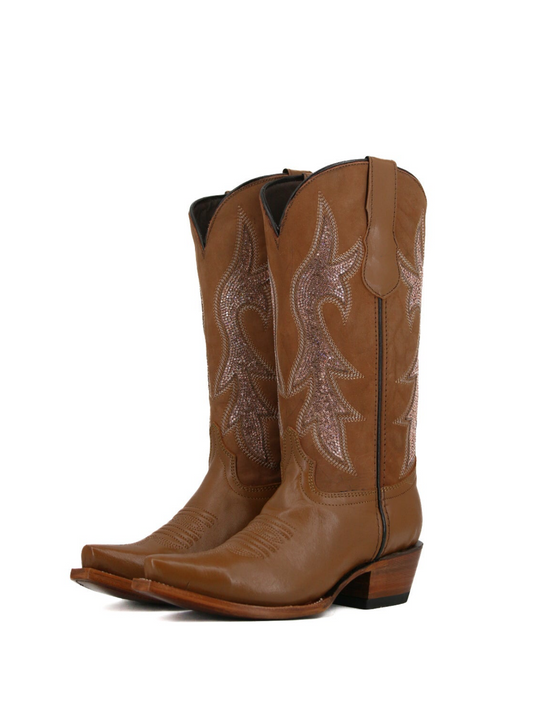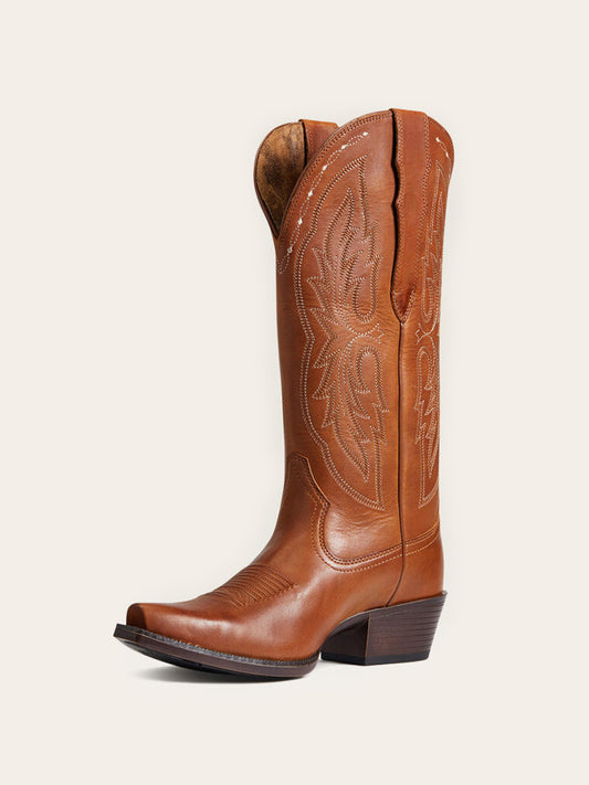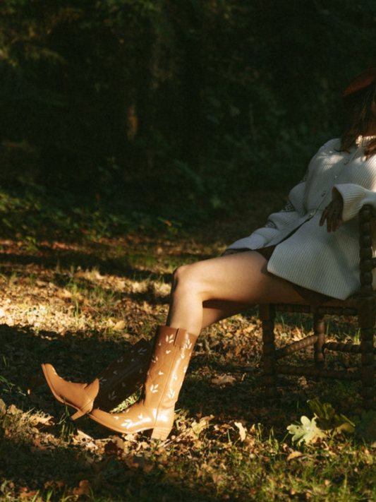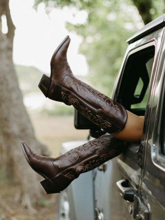 Brown Snip-Toe Embroidery Tall Wide Calf Knee High Cowgirl Boots