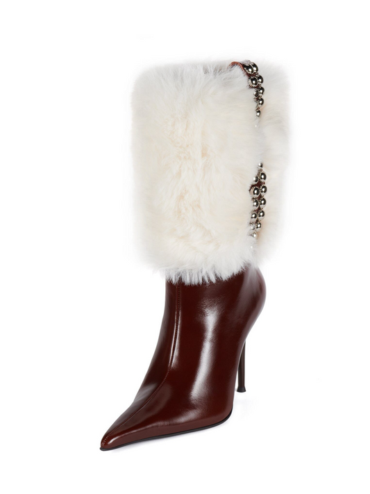Brown Pointed-Toe Faux Fur Studded Wide Mid Calf Stiletto Boots