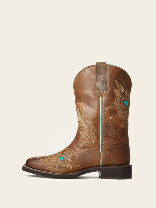 Brown Square-Toe Leaf Embroidery Wide Mid Calf Cowgirl Boots