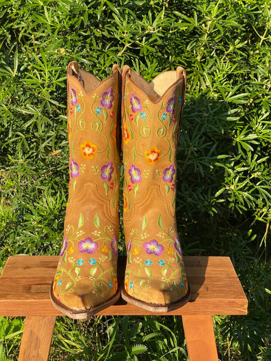 Brown Faux Suede Snip-Toe Colorful Floral Embroidery Wide Mid Calf Cowgirl Boots