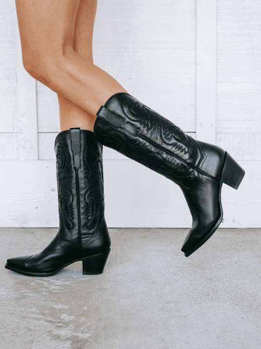 Black Snip-Toe Western Embroidery Wide Mid Calf Cowgirl Boots