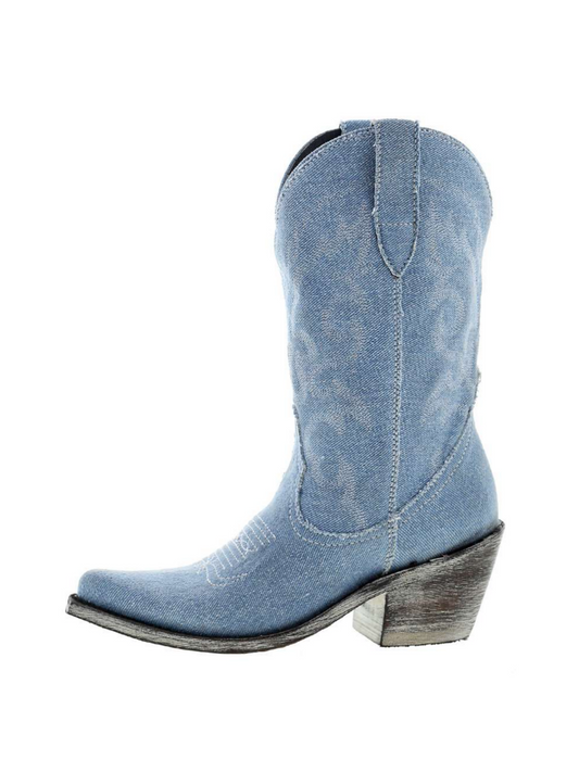 Blue Denim Snip-Toe Embroidery Wide Mid Calf Cowgirl Boots