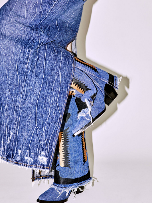 Blue Denim Fold-Over Panel Embroidered With Eagle And Heart Wide Mid Calf Boots