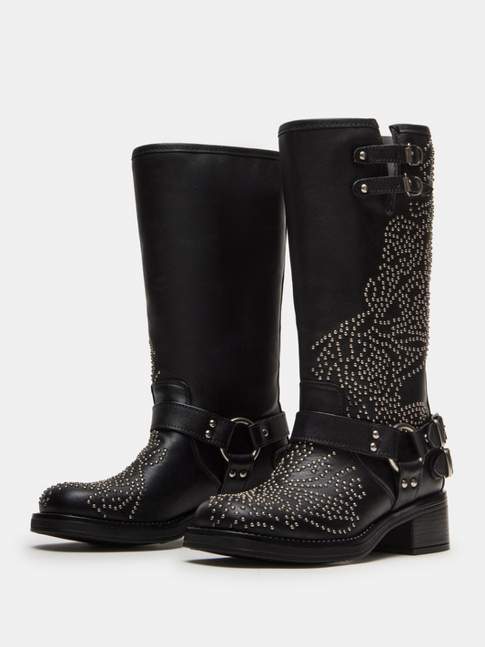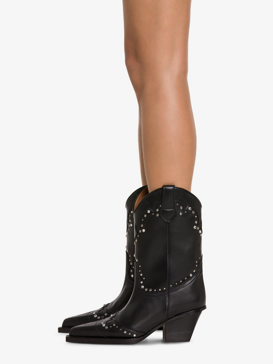 Black Snip-Toe Studded Rhinestone Classic Wide Mid Calf Cowgirl Boots