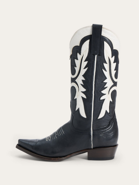 Black Snip-Toe White Inlay Wide Mid Calf Cowgirl Boots