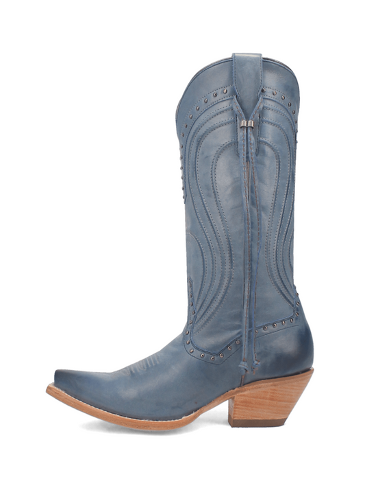 Blue Snip-Toe Studded Embroidery Pull-On Tab Tassel Wide Mid Calf Cowgirl Boots