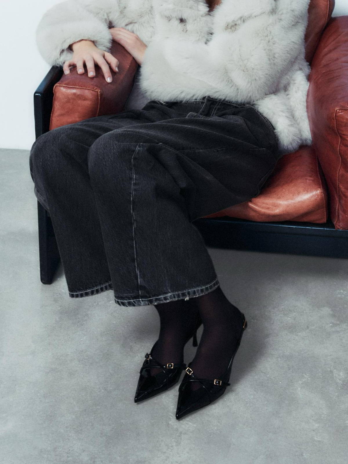 Black Patent Pointed-Toe Double Buckle Front Strap Slingback Pump High Heels
