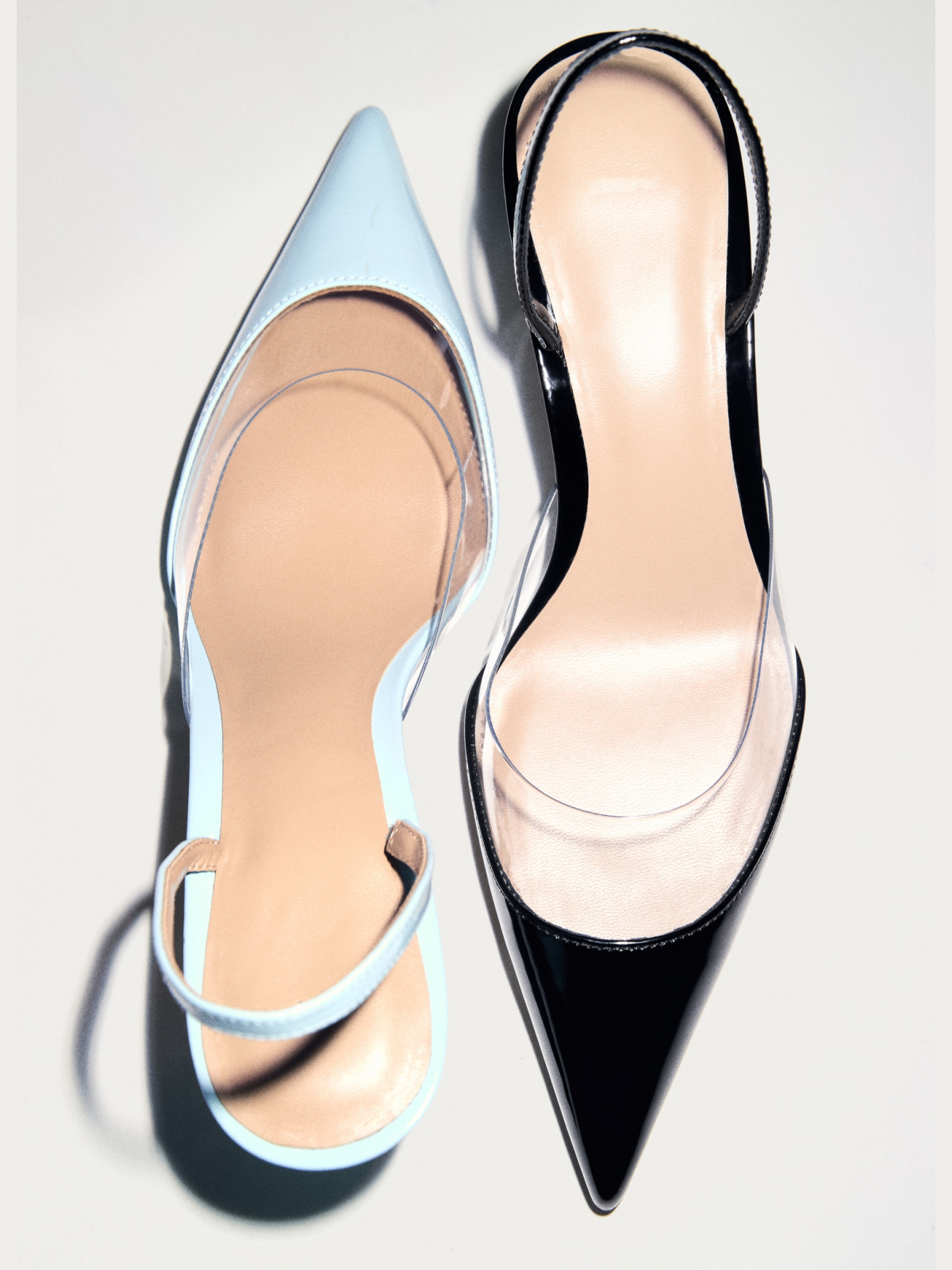 Contrast Patent Black And Transparent Vinyl Panel Pointed-Toe Slingback Kitten Heels