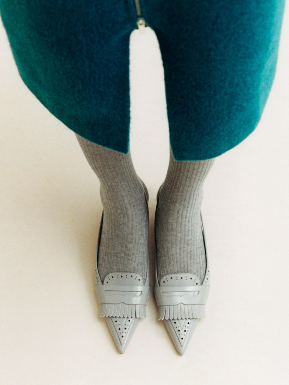 Step into a world of effortless sophistication with these heels. The soft gray hue offers a neutral, versatile base, while the pointed-toe design adds a touch of sharp elegance. Intricate fringe details cascade down the side, bringing texture and movement to the sleek silhouette.