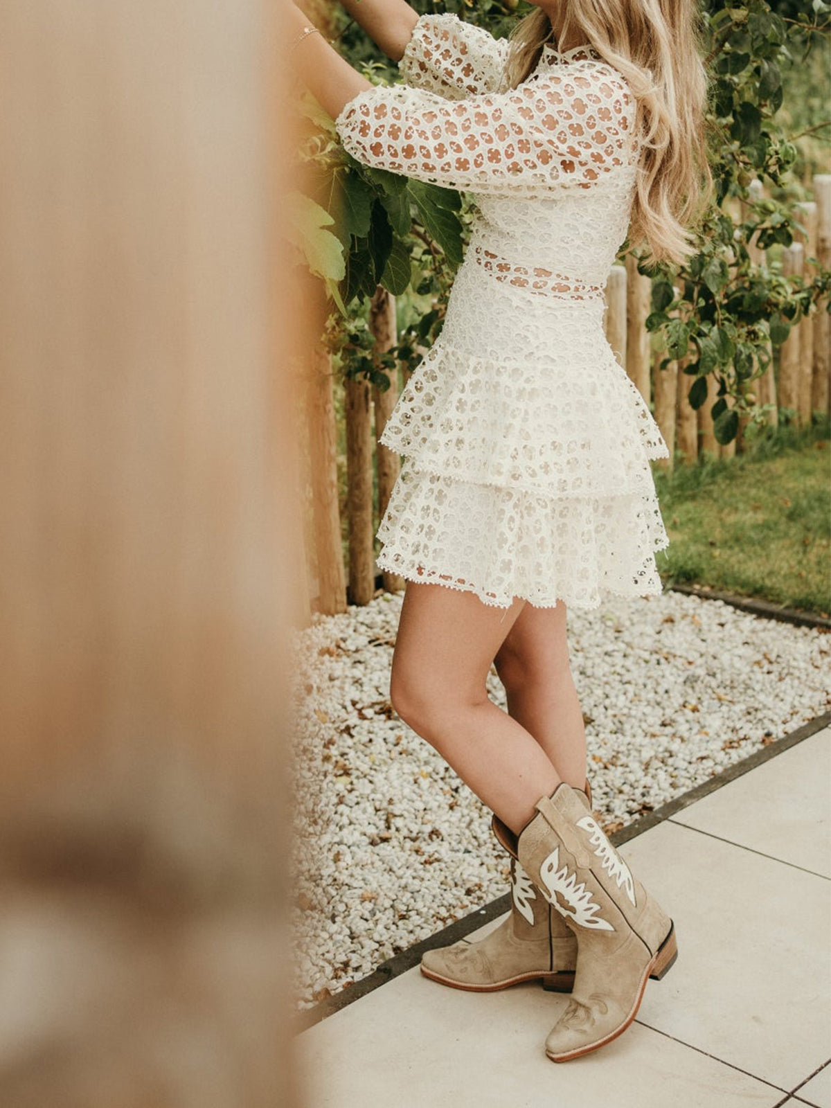 These boots feature a soft sand-colored faux suede material, complemented by bold eagle embroidery on the sides. The snip-toe design and mid-calf height create a flattering, classic Western silhouette, while the striking eagle detail adds a touch of fierce, adventurous spirit. Perfect for adding a unique, bold statement to your cowgirl look.