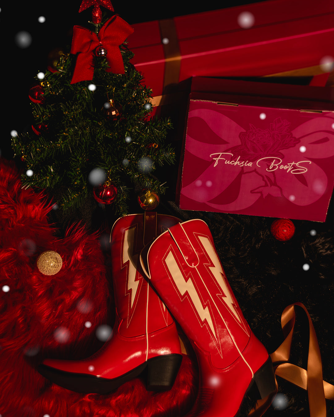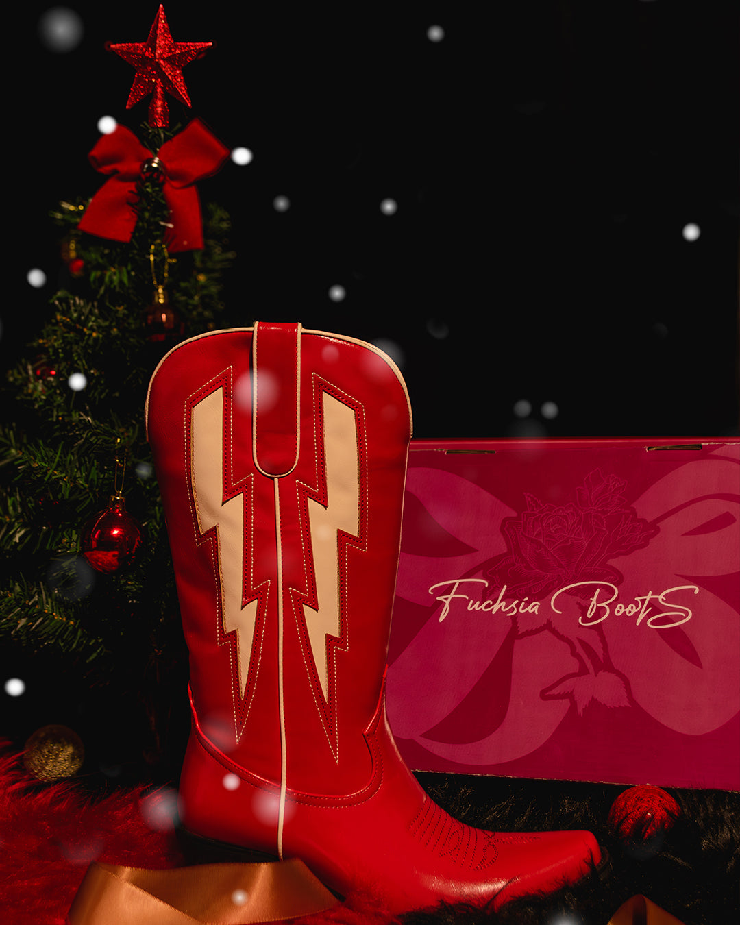 Exude bold energy with striking cream lightning inlays and a snip-toe design on a sleek red base. The wide mid-calf fit ensures comfort, making these cowgirl boots perfect for making a statement at any event.
